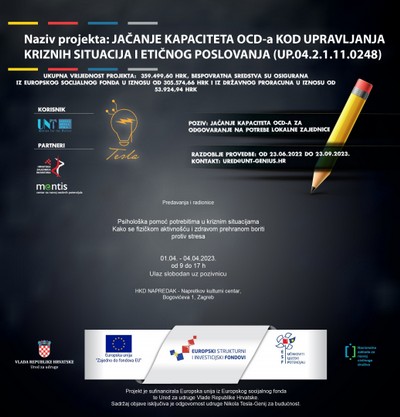 Održane radionice Centra za razvoj osobnih potencijala MentisCentar za razvoj osobnih potencijala Mentis, Partner 2 na Projektu održao je u Zagrebu od 01. travnja do 04. travnja u prostoru HKD Napredak, u Napretkovom kulturnom centru, radionice Psihološka pomoć potrebitim u kriznim situacijama i Kako se prehranom i fizičkom aktivnošću boriti protiv stresa s velikim uspjehom i na zadovoljstvo svih