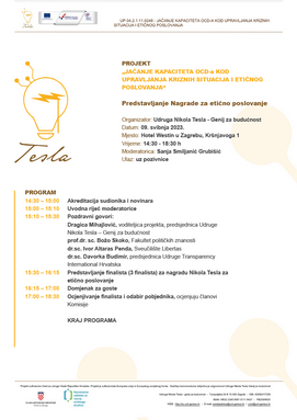 U organizaciji Udruge Nikola Tesla – Genij za budućnost, u utorak, 9.svibnja, bit će održano predstavljanje Nagrade i finalista za Nagradu Nikola Tesla za etično poslovanje u Hotelu Westin s početkom u 14.30 sati. Nagrada je dio projekta „Jačanje kapaciteta OCD-a kod upravljanja kriznih situacija i etičnog poslovanja“ koji Udruga Nikola Tesla - Genij za budućnost provodi s partnerima Hrvatskom zajednicom inovatora i Centrom za razvoj osobnih potencijala Mentis. Projekt je sufinancirala Europska unija iz Europskog socijalnog fonda i Ured za udruge Vlade Republike Hrvatske.